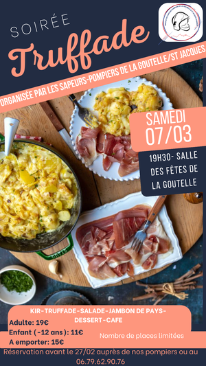 Samedi 7 mars à 19h30. Soirée truffade des pompiers. Salle des Fêtes. La Goutelle.